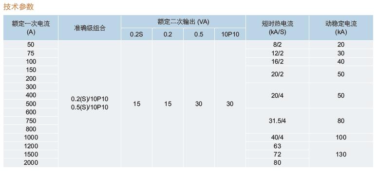 1、額定一次電流、準確級組合、額定輸出及動、熱穩定電流見表